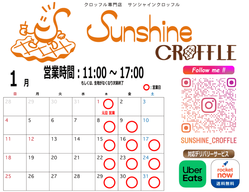 最新の営業情報は公式Instagramをご確認ください! Instagram@sunshine_croffle