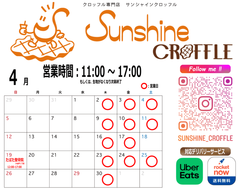 最新の営業情報は公式Instagramをご確認ください! Instagram@sunshine_croffle