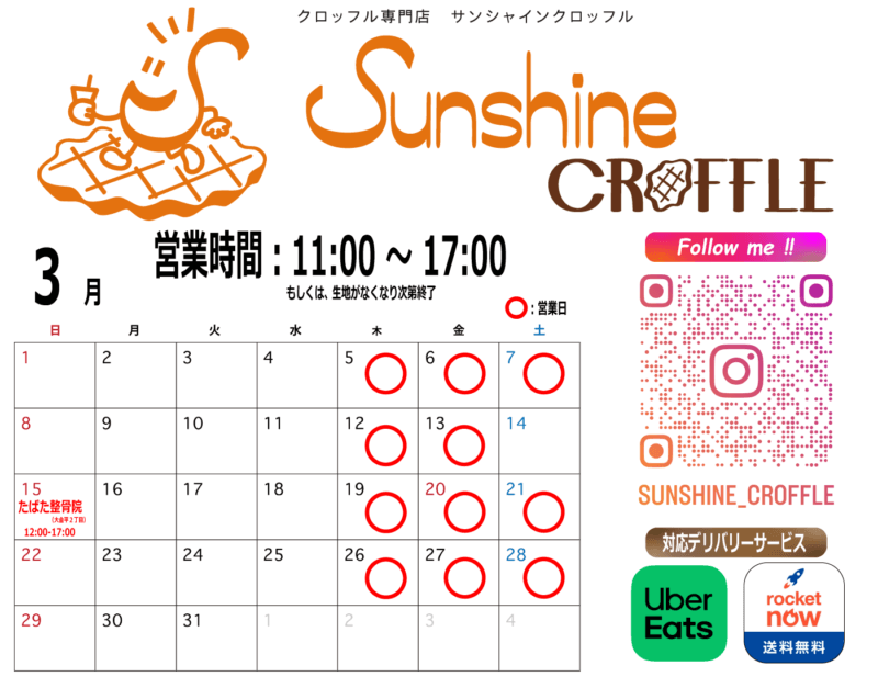 北小金の定番スイーツ店を目指すサンシャインクロッフルは、2026年3月の営業日を掲載したカレンダーを公開いたします。